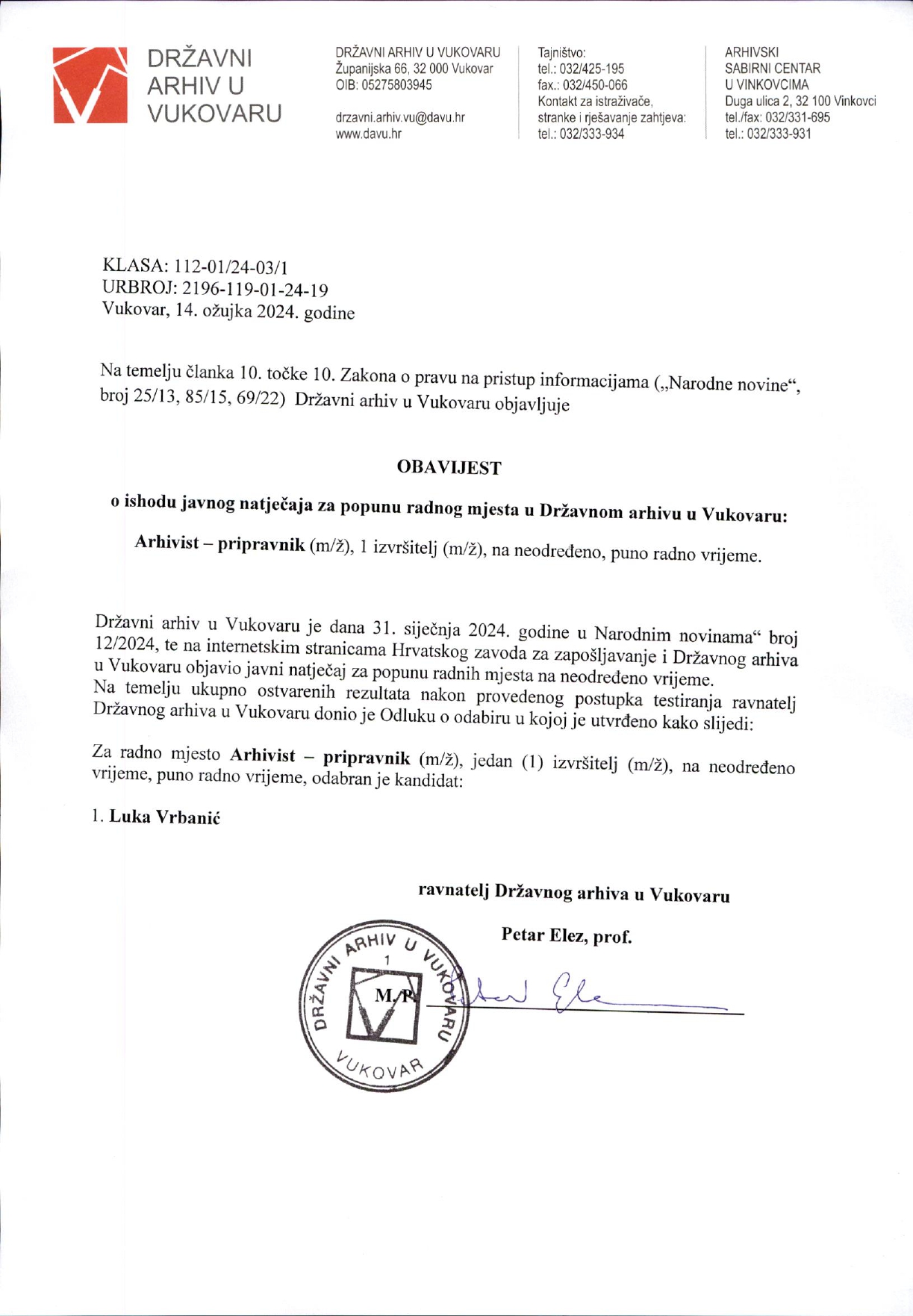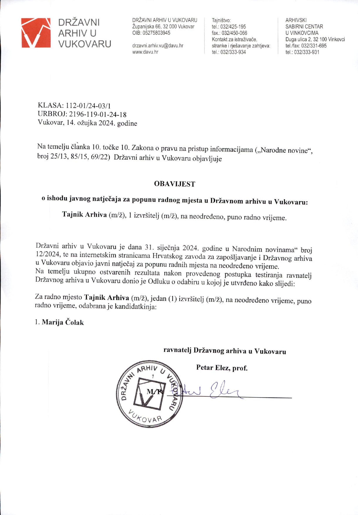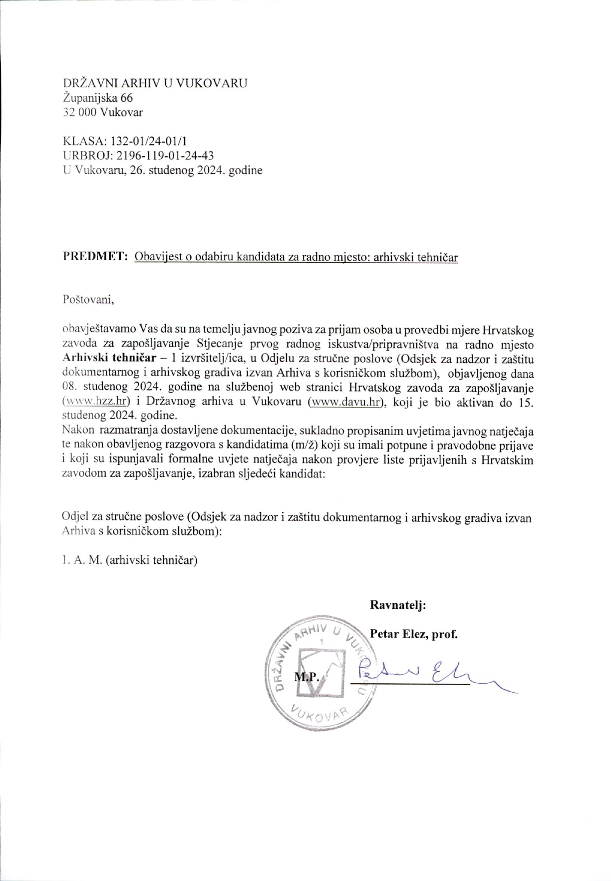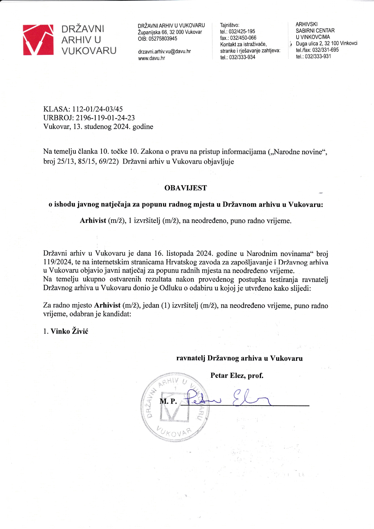 obavijest o ishodu natječaja: arhivski tehničar-pripravnik 2024. godine