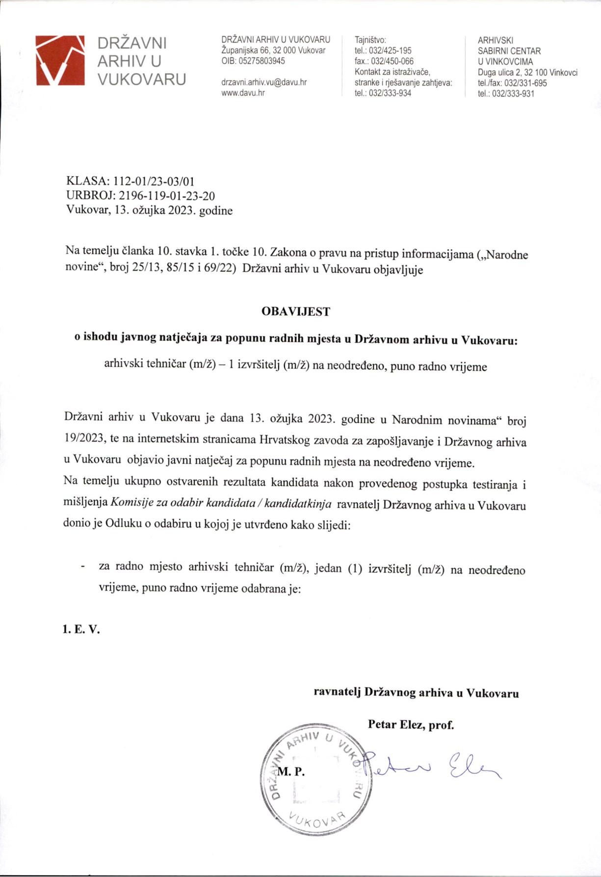 Obavijest o ishodu javnog natječaja za radno mjesto: arhivski tehničar