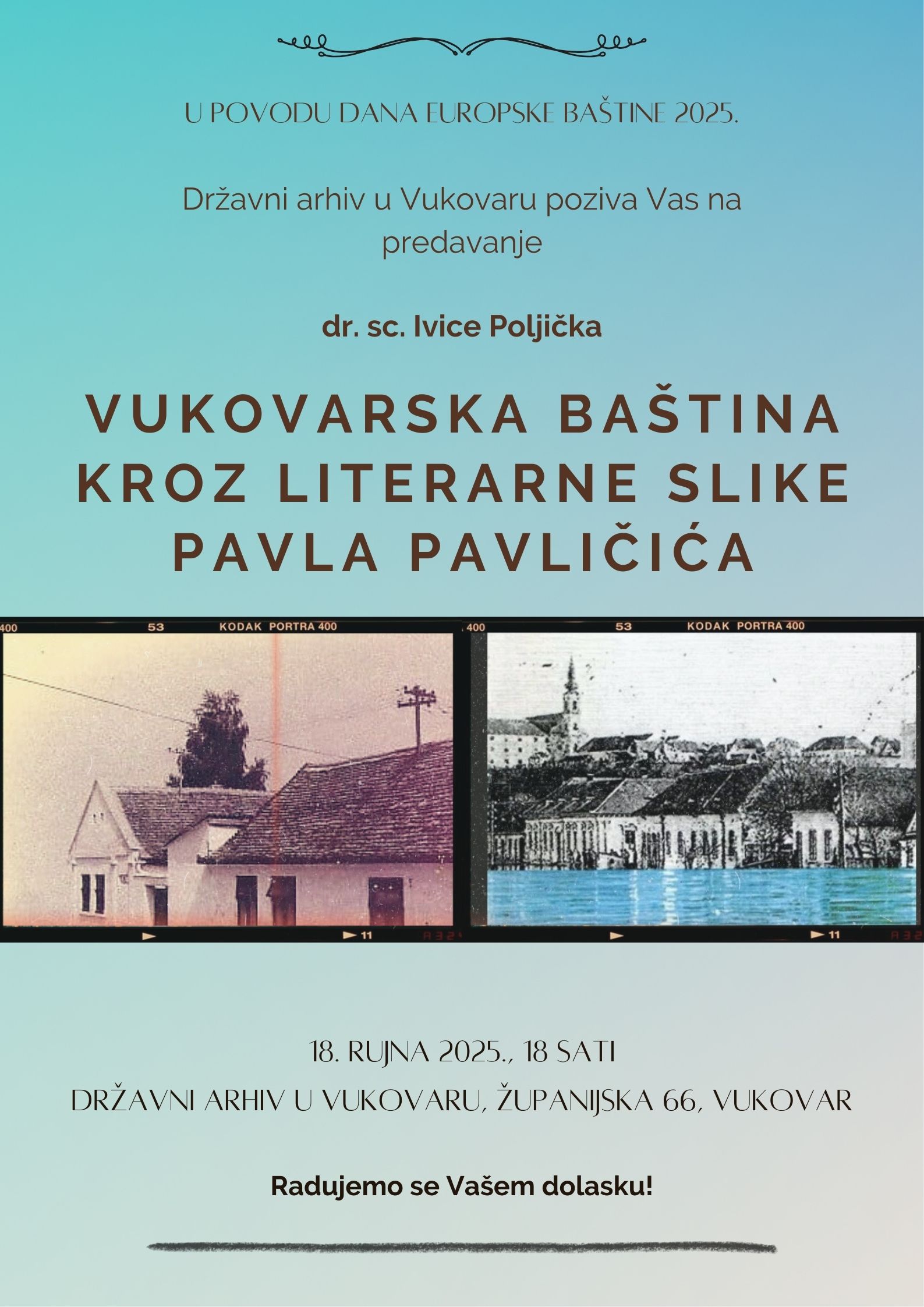 Povodom Dana europske baštine, u dvorani Državnog arhiva u Vukovaru, 18. je rujna održano javno predavanje dr. sc. Ivice Poljička pod nazivom Vukovarska baština kroz literarne slike Pavla Pavličića.
